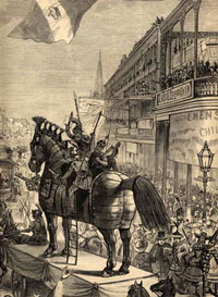A visit by the Russian Grand Duke Alexis Romanoff was the partial inspiration for the first appearance of Rex in 1872. The King of Carnival immediately became the international symbol of Mardi Gras. Rex presented Mardi Gras' first organized daytime parade, selected Carnival's colors--purple, gold and green, produced its flag, and introduced its anthem, "If Ever I Cease To Love." In 1872, the Knights of Momus also entered the Carnival scene.